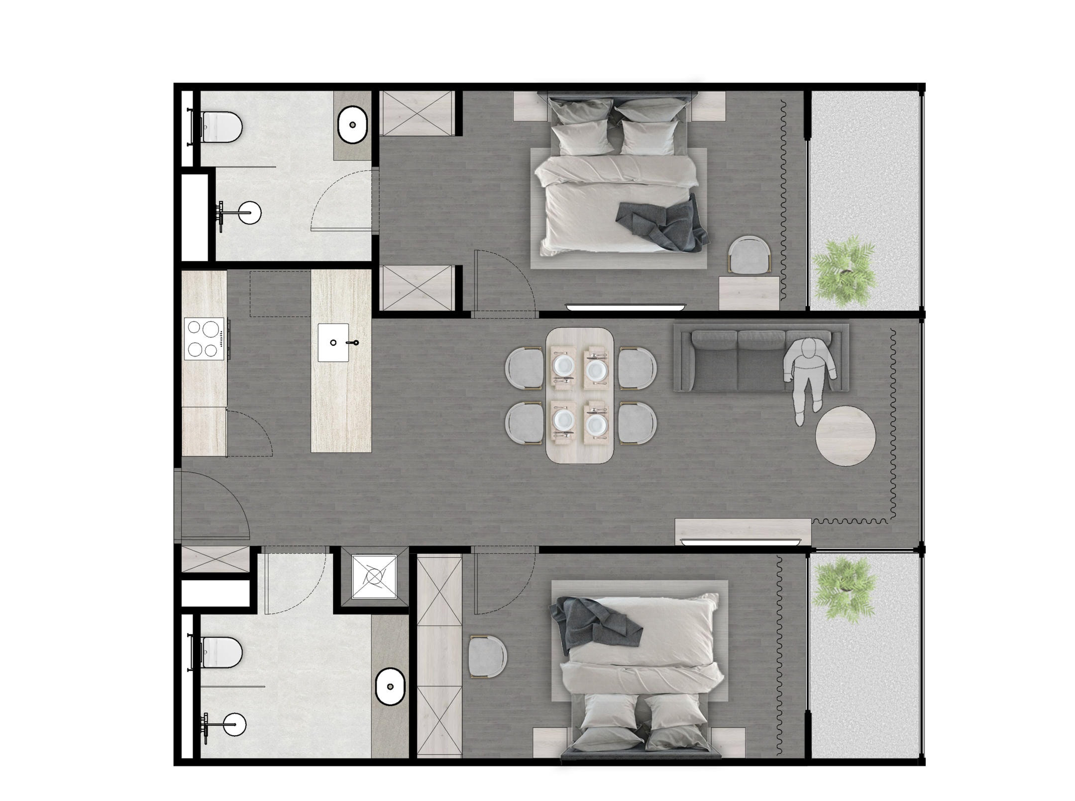 At the heart of the complex is a unique courtyard garden with tropical plants, creating an atmosphere of tranquility, privacy, and harmony with nature.